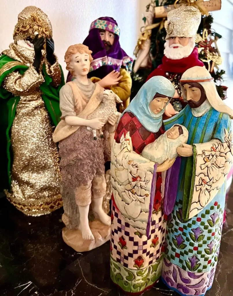 At stop after stop, she opens the little tin door and places deep in the shadows the shepherds and wise men, the donkeys lank and weary, the cow who chews and muses