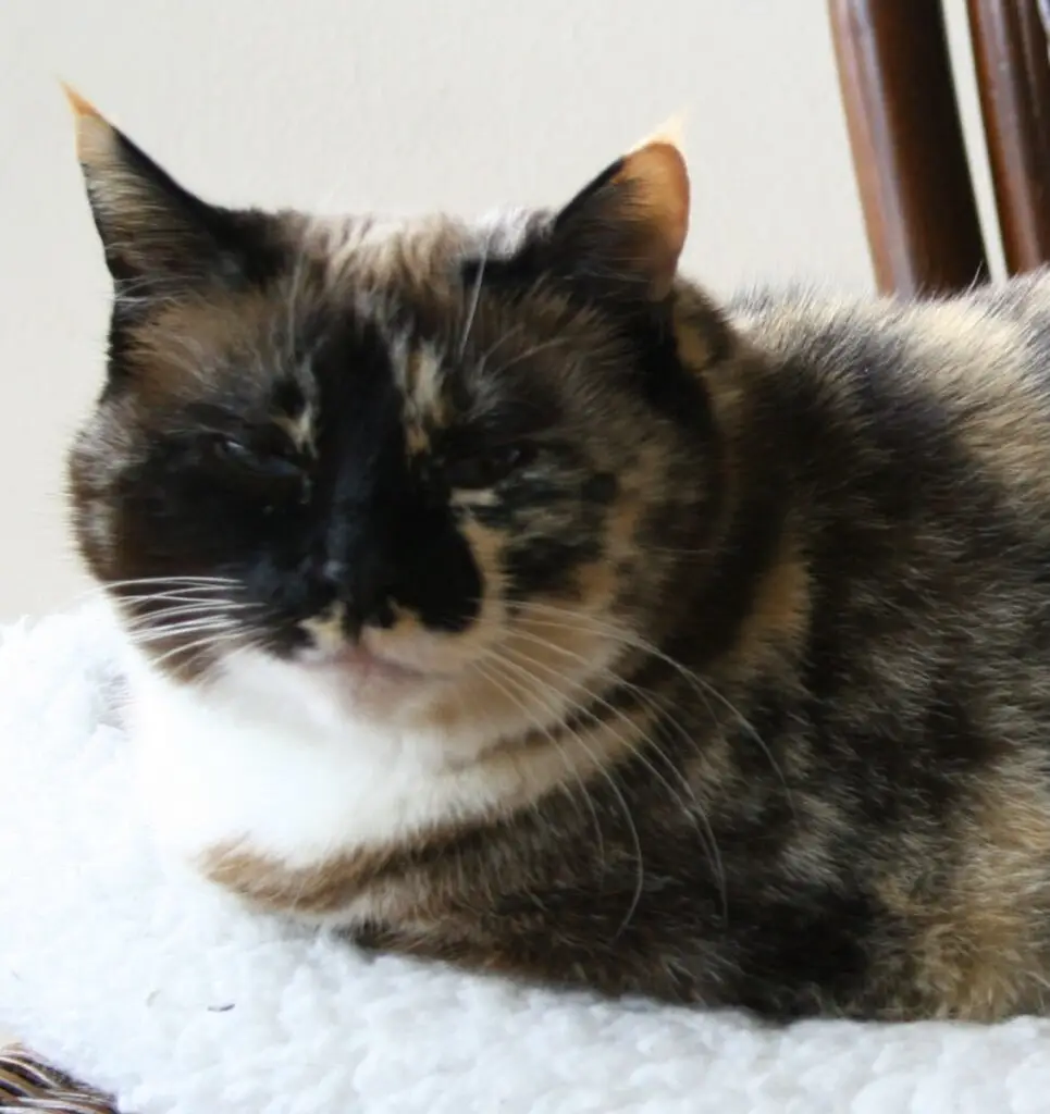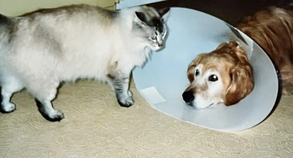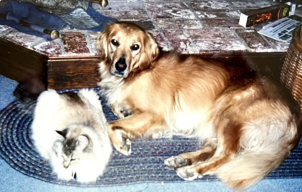 We were greatly saddened when Arthur passed, and didn’t feel ready for another catfor a long time. Finally we adopted two rescue cats: Amy, a tortoise shell Siamese, and Nikki, a feral rag doll. They were close friends with each other and our Golden Lacey.