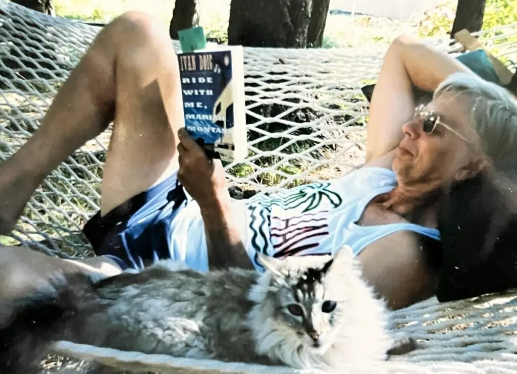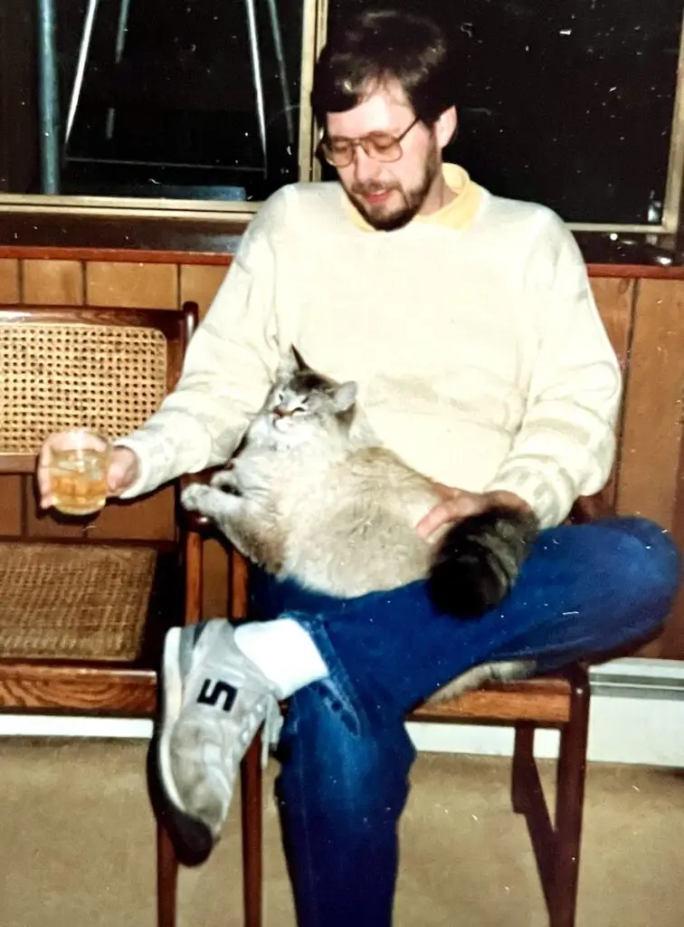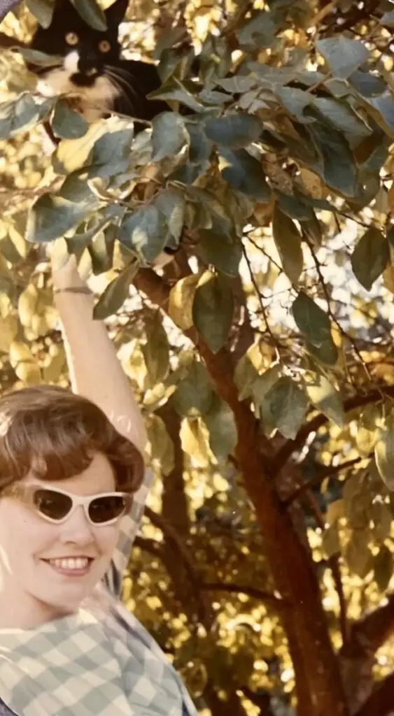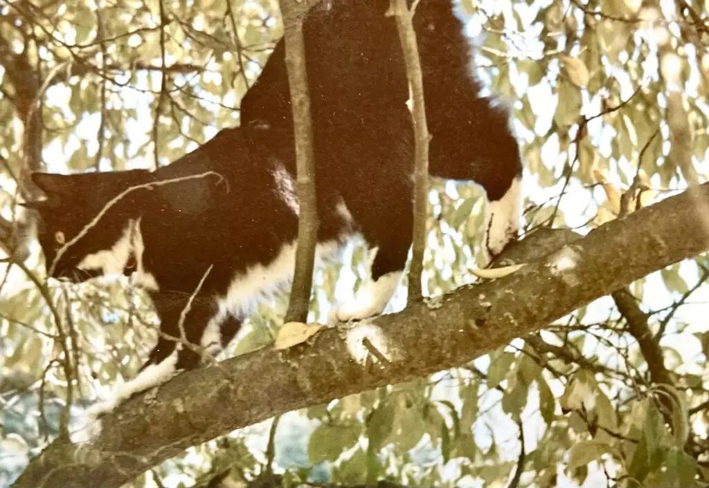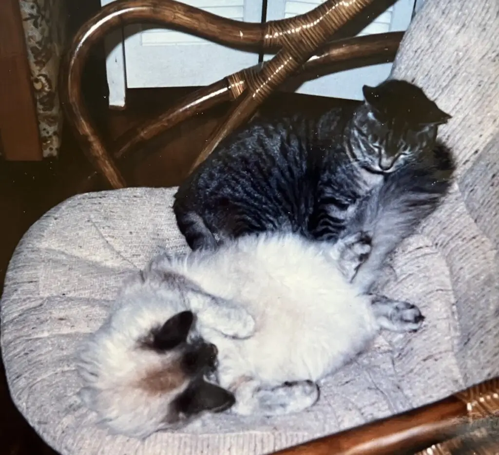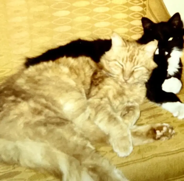 We didn’t give up on becoming cat parents, and Agnes was followed by a series of long-lived kitties! We next adopted a tiny “tuxedo” kitten, “Huey”, and a marmalade” cat “Oliver”, shortly after Huey. They were boon companions, aways sleeping or snuggling together and sometimes playing fiercely! When they stood on two legs and jabbed at each other with a leading paw, they looked like boxers!