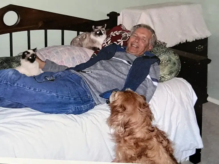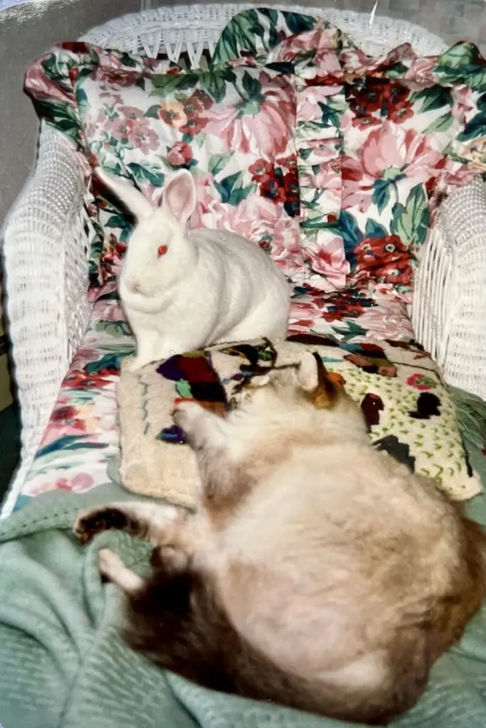 After Agnes passed, Arthur enjoyed total freedom! He was such a character: funny, clumsy, curious, and friendly to people, our dogs, and even visiting rabbits. He loved to relax with Tim indoors and out.