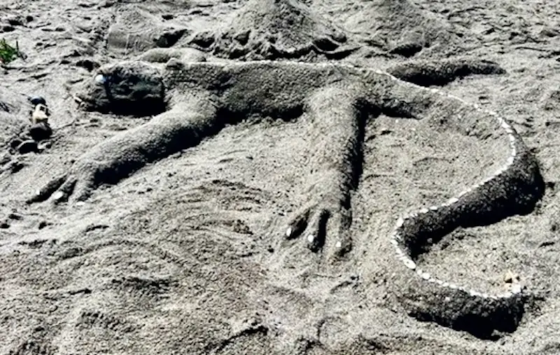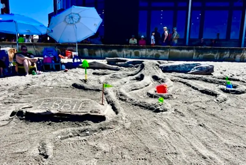 Natural materials are abundant on the beach, and inspire a variety of creative efforts using driftwood and damp sand.