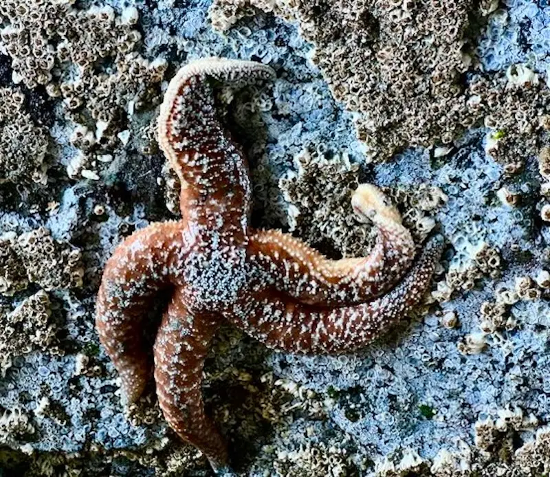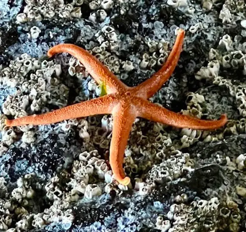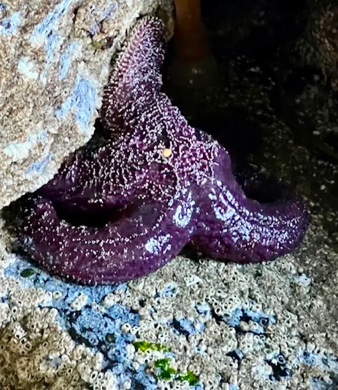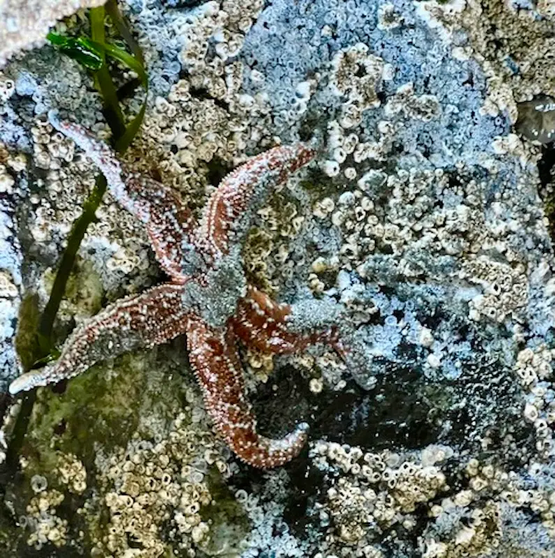 Exploring by rocks and under piers at low tide gives us a closeup view of colorful starfish in many positions.