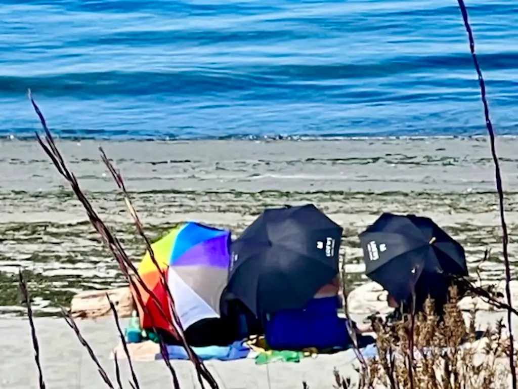 On a hot summer day, our feet cool off by walking on wet sand, maybe wading and watching waterfront scenes, like people relaxing under the shade of colorful beach umbrellas.